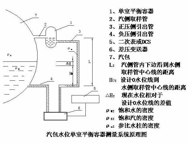 單室平衡容器主要測量原理:利用正壓測、負壓側(cè)形成的差壓信號到變送器,變送器將信號傳送到DCS內(nèi)進行公示計算,然后實現(xiàn)水位的測量。單室平衡容器與差壓變送器配套使用,對汽包水位進行監(jiān)控,并對外輸出水位變化時的差壓信號,差壓變送器再將差壓信號轉(zhuǎn)化成電信號送入DCS系統(tǒng)或其它的顯示儀表或控制設(shè)備,只能反映鍋爐正常運行時汽包內(nèi)的水